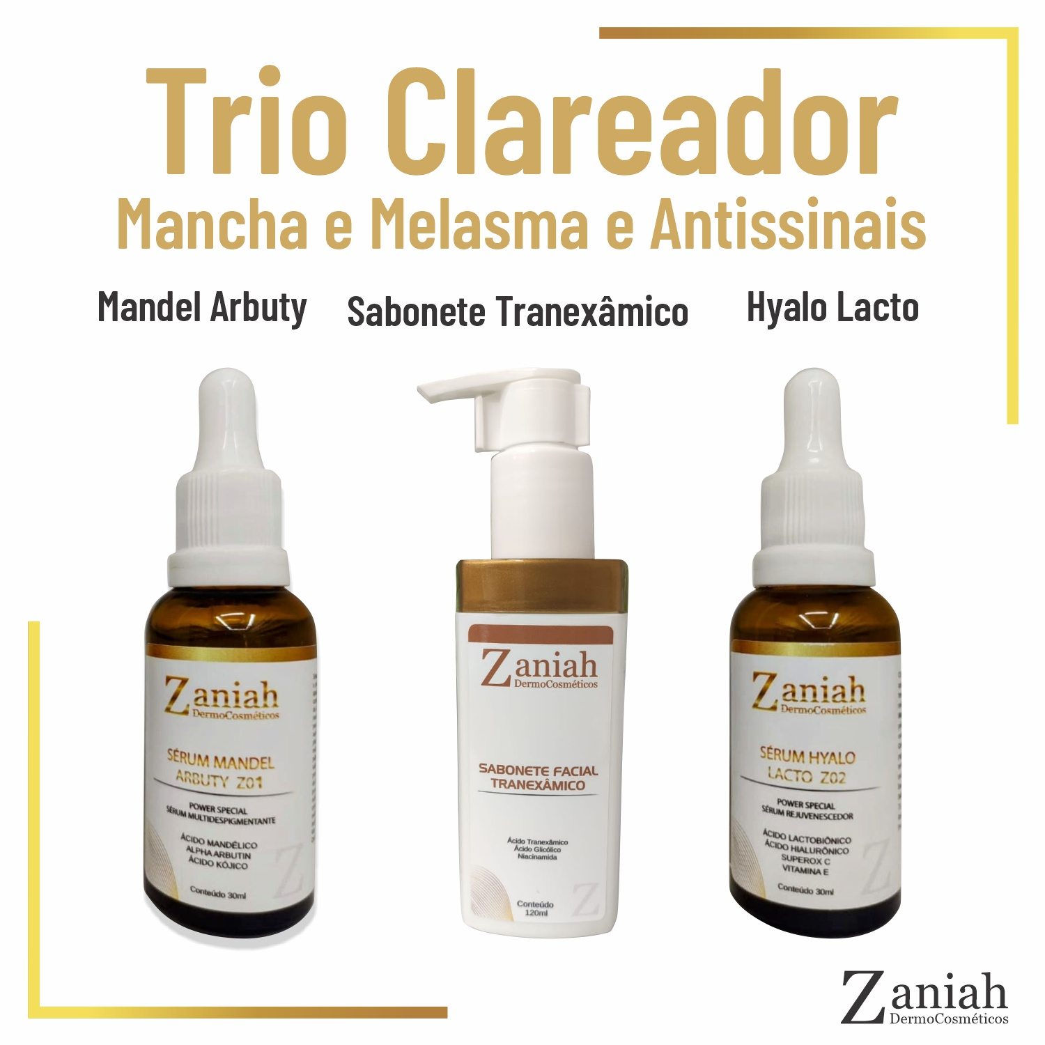 O Kit Z15 Tranexâmico, Mandelico & Hyalo Lacto daZaniah Dermocosméticos  é a nossa escolha de o melhor clareador de manchas de pele. Desenvolvido com ativos consagrados no combate à hiperpigmentação, o kit une o poder do Ácido Tranexâmico, do Ácido Mandélico e do antioxidante Hyalo Lacto — uma combinação inteligente para suavizar manchas escuras, melasma, marcas de acne e uniformizar o tom da pele.